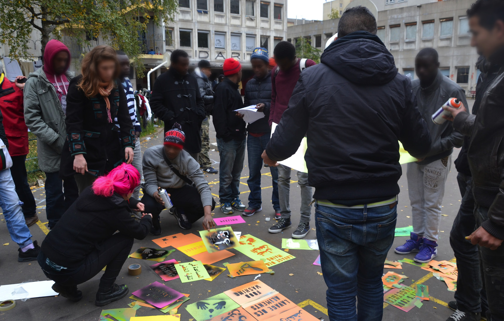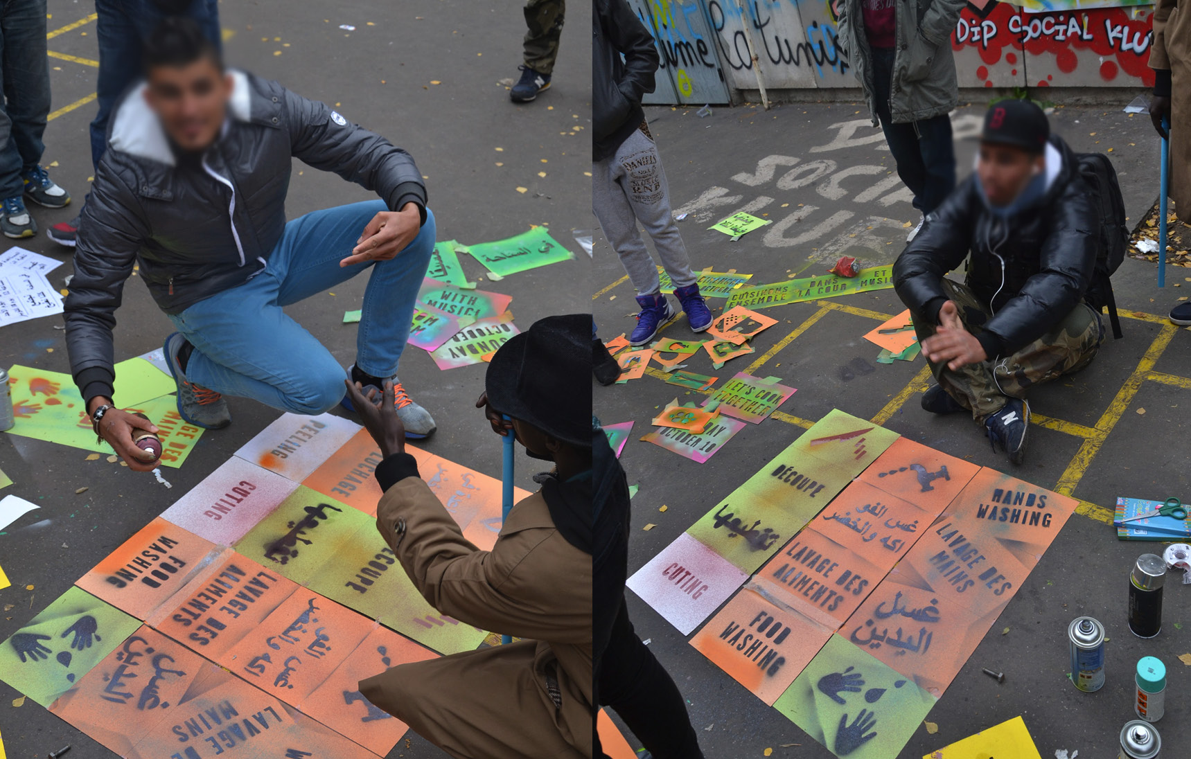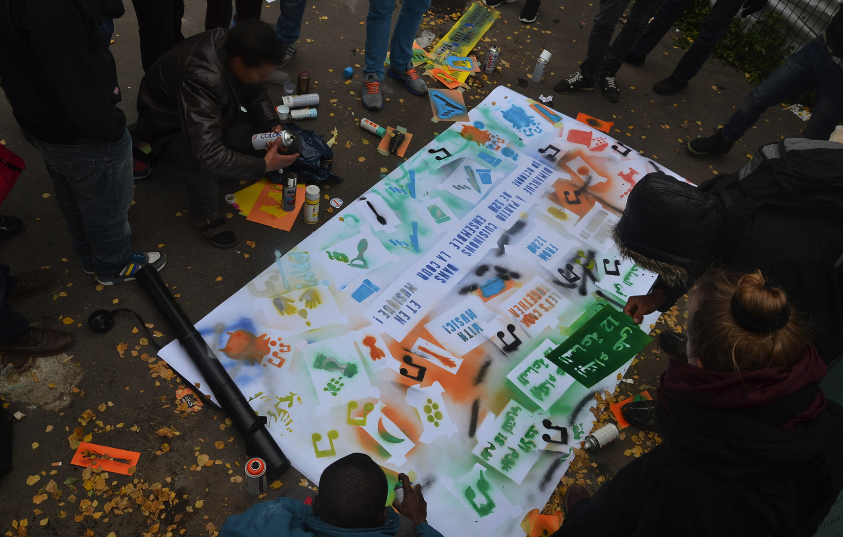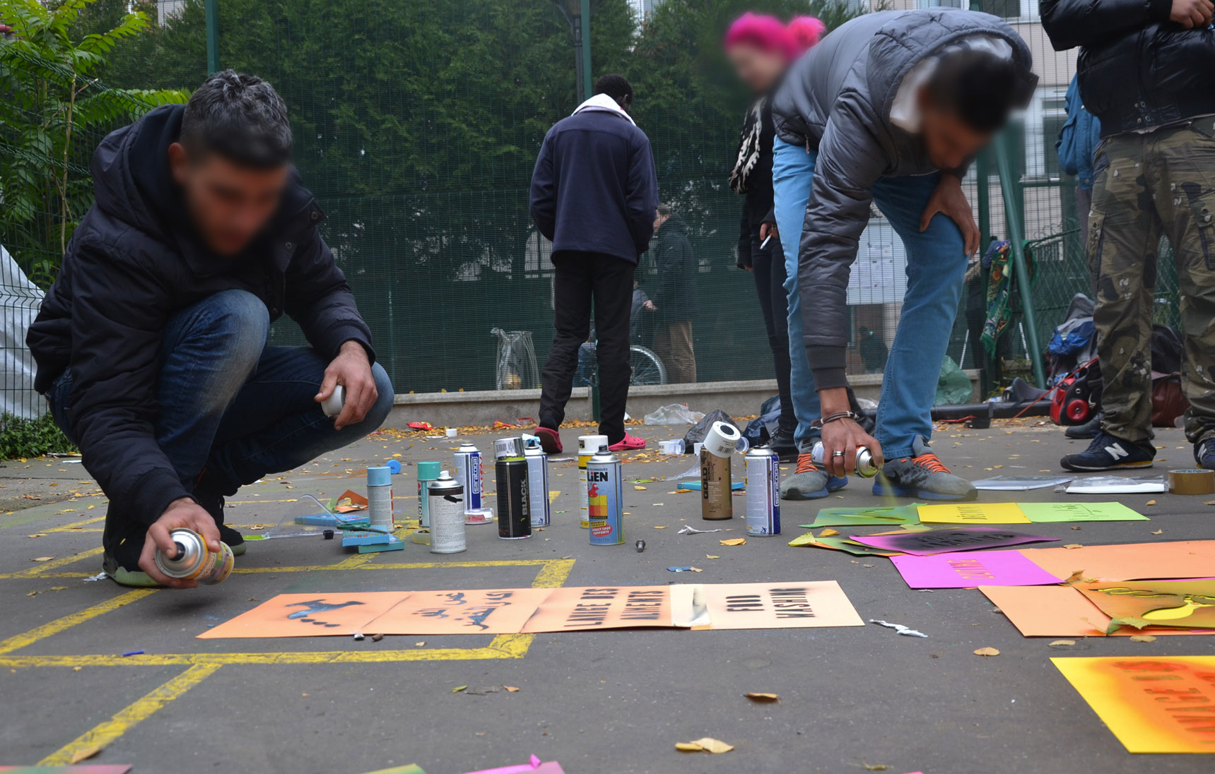 Disco Fugees Atelier pancartes au pochoir pour l'organisation d'une Disco Soupe dans un squatt de refugiés Transmission Tous les projets