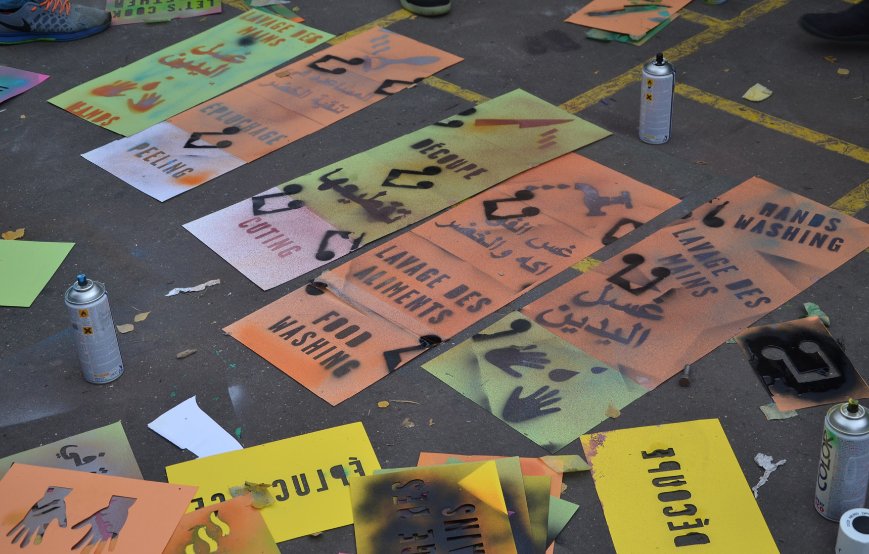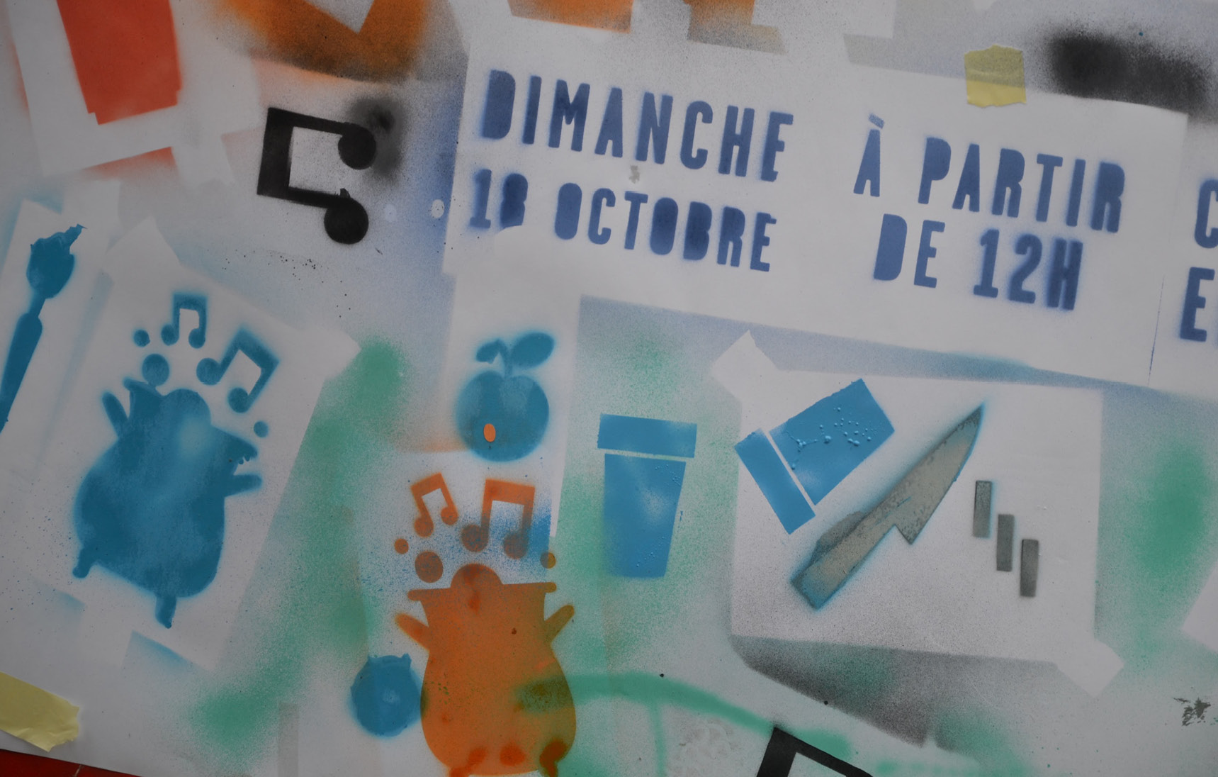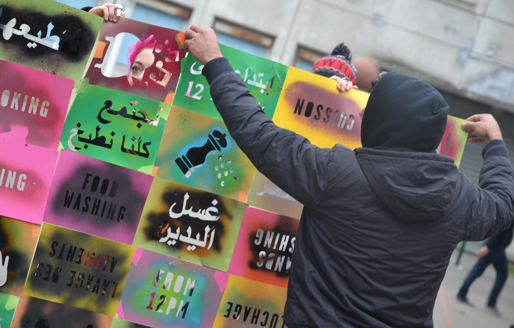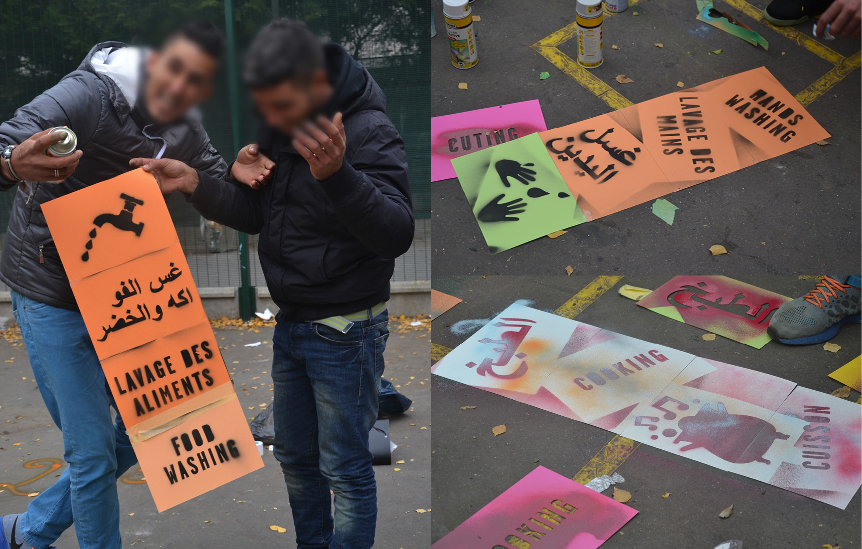 Disco Fugees Atelier pancartes au pochoir pour l'organisation d'une Disco Soupe dans un squatt de refugiés Transmission Tous les projets