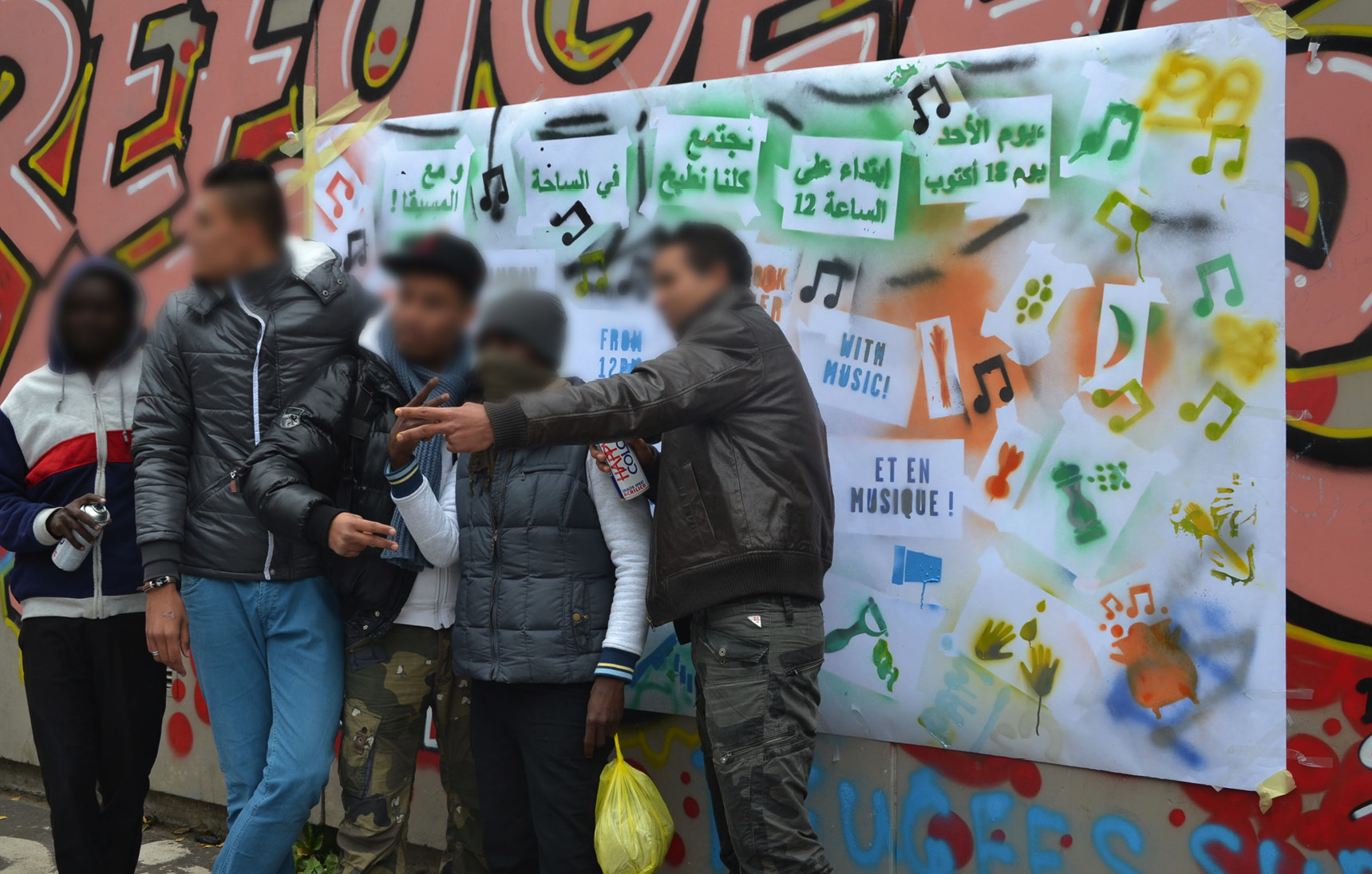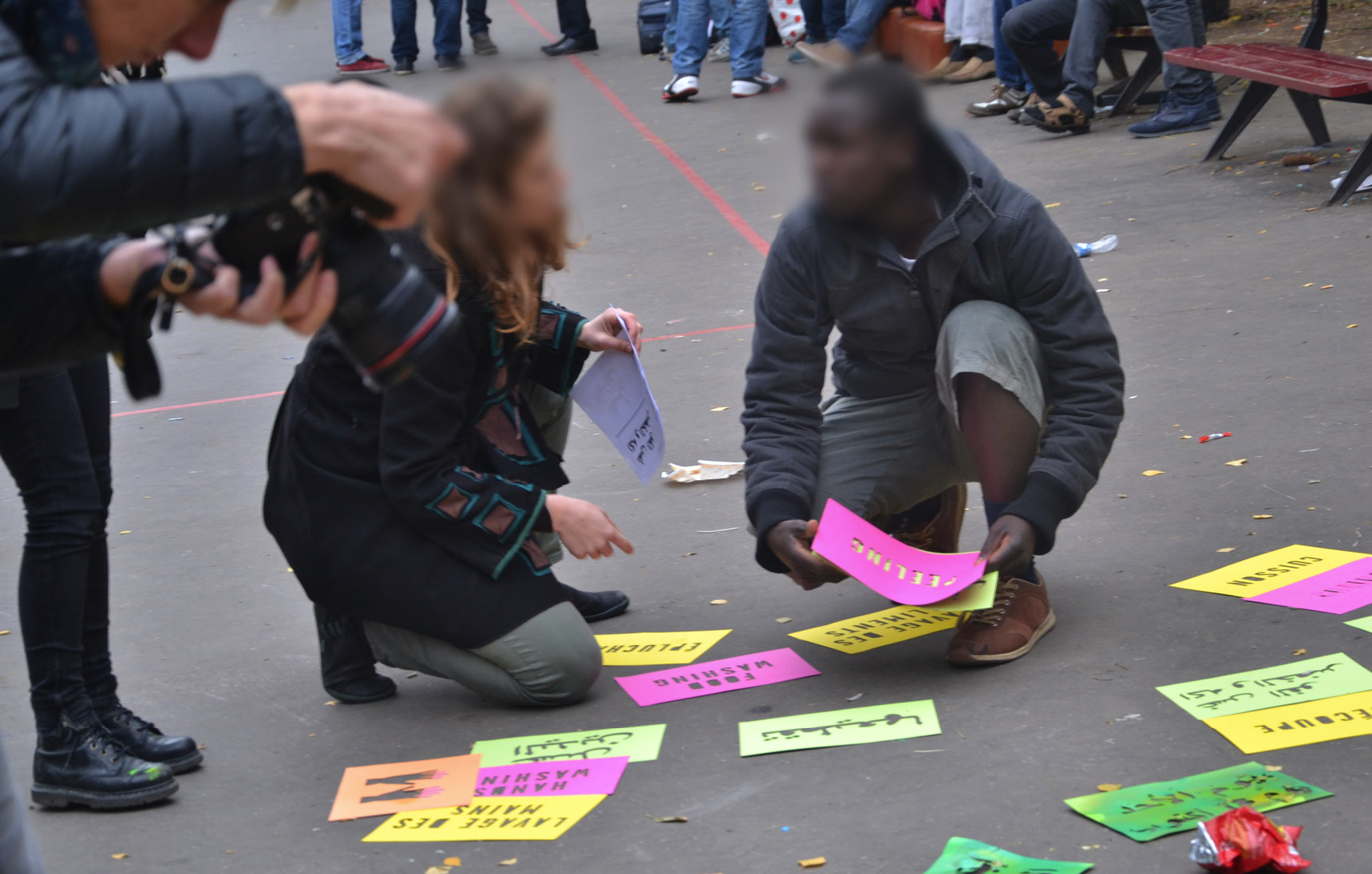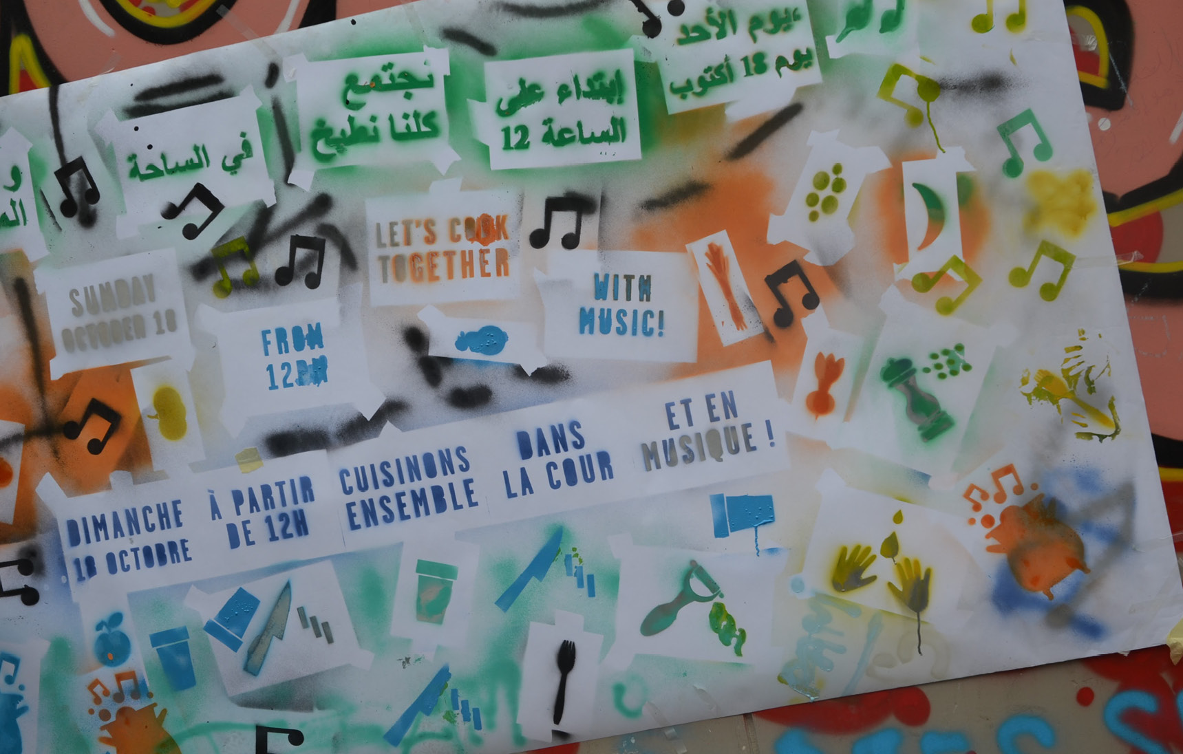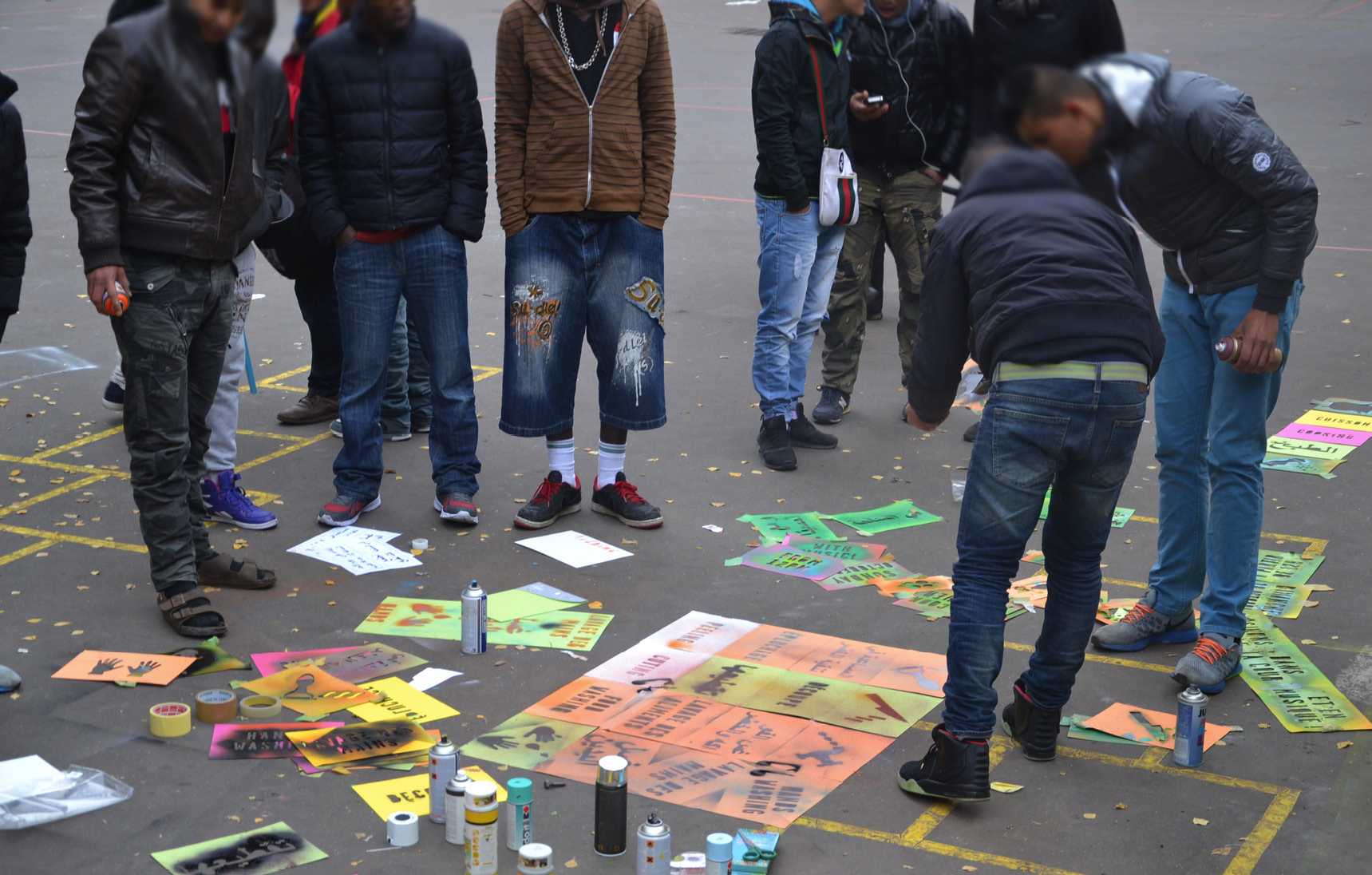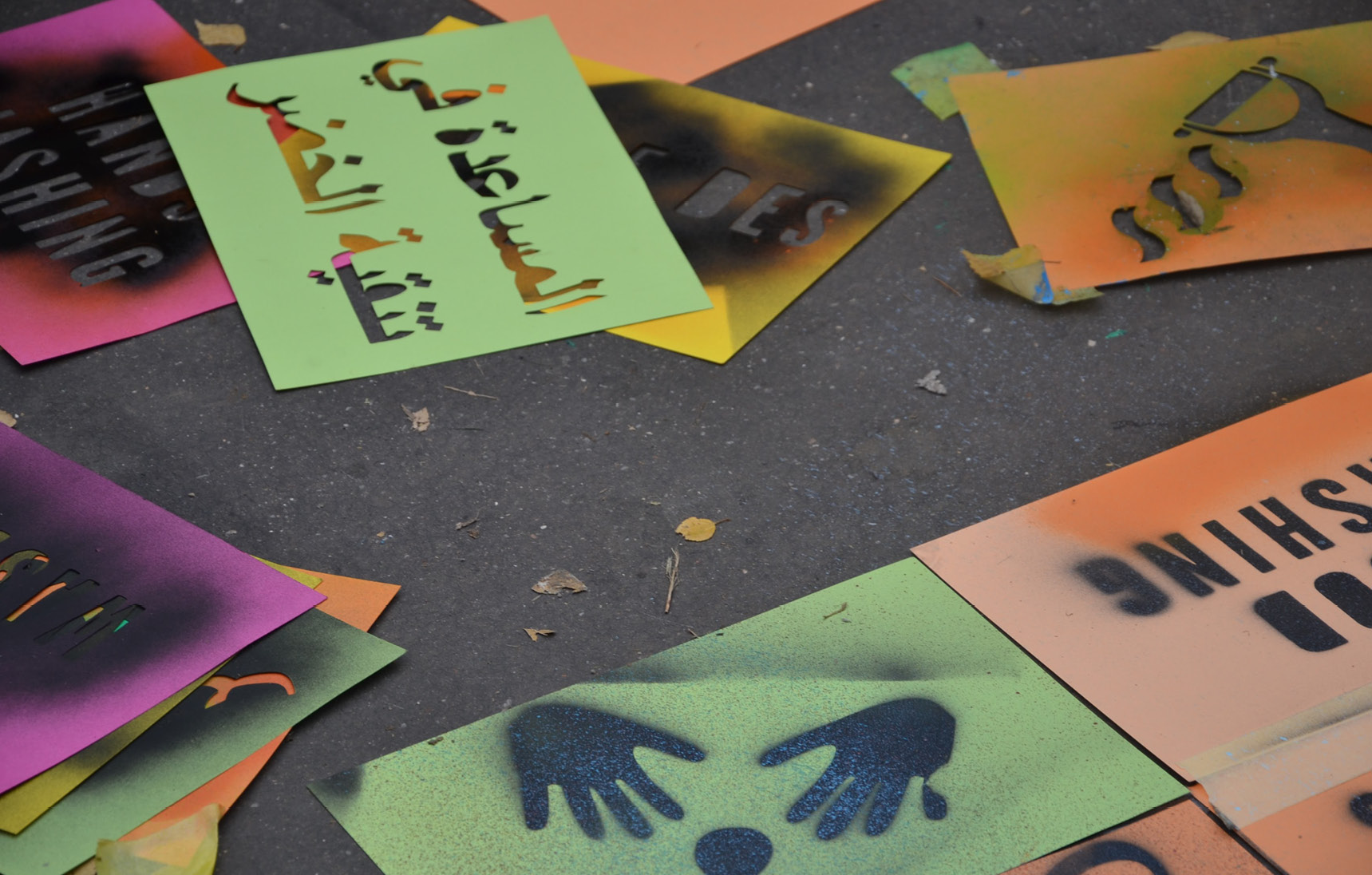 Disco Fugees Atelier pancartes au pochoir pour l'organisation d'une Disco Soupe dans un squatt de refugiés Transmission Tous les projets